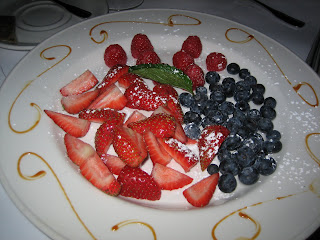 Finally, AZ attempted to order a plate of mixed berries. Both the waiter and runner told her no. And AZ was even more pissed, especially after the whole salmon incident. Then when the desserts arrived, the waiter showed up with a plate of berries. Ooookay. Granted, it was one of the silliest, most anemic-looking "desserts" I've ever seen offered in a restaurant, but I suppose it was indeed a plate of berries. I'm sorry, but I can't really give them credit for this. I mean, really.